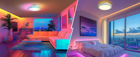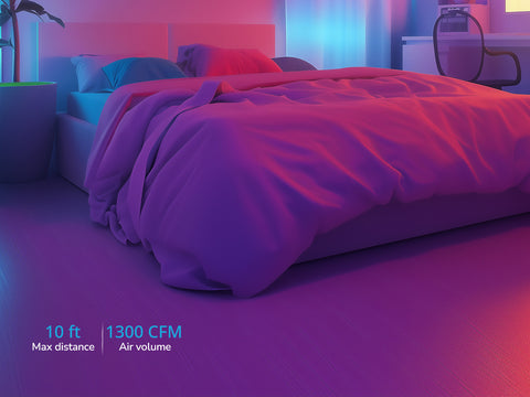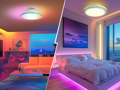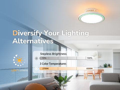 - Triple-Layer Illumination System:This modern ceiling fan integrates a dimmable main LED light (3000K–6500K color temperature), a customizable RGB halo light ring, and a soft top-mounted backlight for ambient mood lighting. The main light offers dazzling yet balanced brightness , while the RGB halo provides many colors via app control, adapting to any occasion—from vibrant parties to cozy nights.