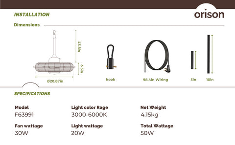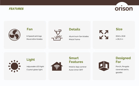 - Multiple Adjustments: With 6- speed adjustment, 3 color temperatures ranging from 3000K to 6000K, 10%-100% stepless brightness adjustment, reverse mode, night mode and sleep timer settings, this Orison gazebo fan meets all your needs.