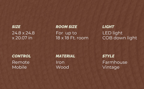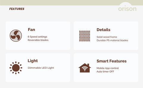 - [Fan]: 3 wooden blades, 6 speeds, reversible wind. Silent DC motor.