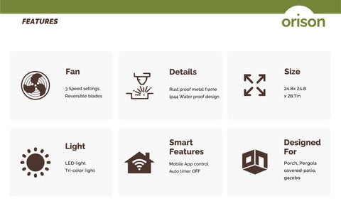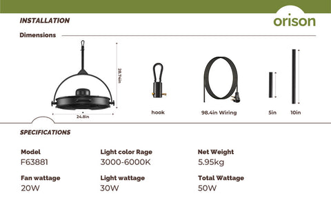 - 24.8 Inch Orison Outdoor Ceiling Fan-63881: designed for durability and performance, featuring waterproof and corrosion-resistant qualities that ensure longevity. Perfectly suited for outdoor environments like gazebos, patios, porches, tool rooms, pergolas, and caravans, it brings comfort and style to any setting.